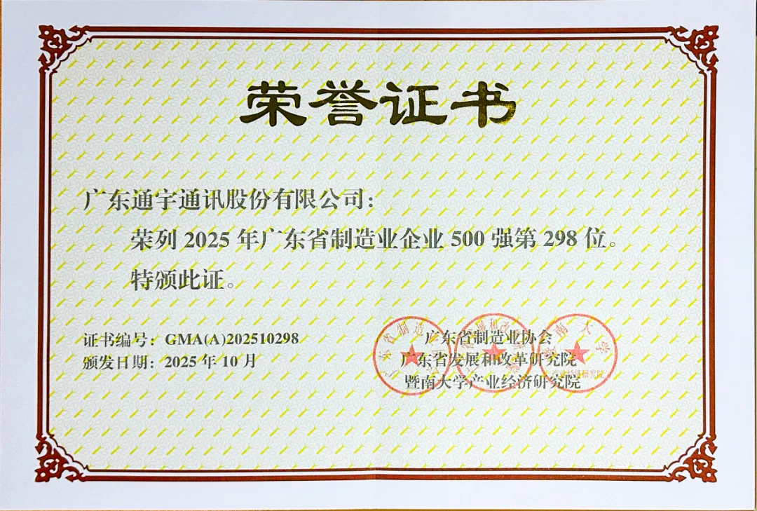 Tongyu Communications secured a place on the “2025 Guangdong Top 500 Manufacturing Enterprises” list through its outstanding performance and significant contributions in the communications equipment manufacturing sector. This honor not only represents high recognition of Tongyu Communications' years of dedication to manufacturing and commitment to innovation but also powerfully demonstrates its benchmark status in advancing the high-quality development of Guangdong's manufacturing industry.