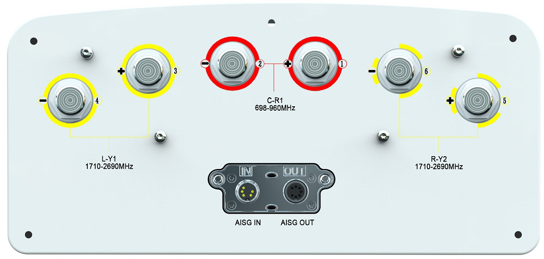 Equipped with 2×8 pin circle connectors compliant with IEC 60130-9 and AISG standards, the T1002M6R031 sector antenna supports daisy chaining configurations. With male inputs and female outputs, this design simplifies installations and enhances operational flexibility. The connectors include configurations for power (Pin 1: 12V) and data communication (Pins 3 and 5 for RS485B and RS485A, respectively), making it easy to integrate into existing networks.