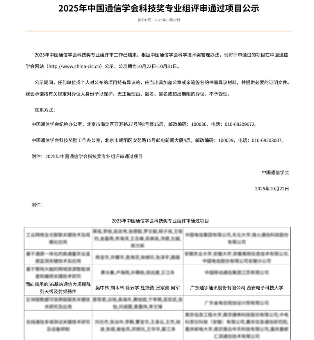 Recently, the project “Commercial-Grade 5G Base Station Communication Massive Array Antennas and RF Components,” jointly submitted by Tongyu Communications and Xi'an University of Electronic Science and Technology, was successfully selected for the 2025 China Institute of Communications (CIC) Science and Technology Award professional group review and honored with the Second Prize.