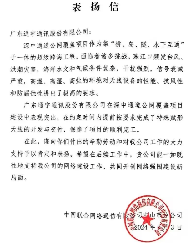 最近,通宇通讯因在深中通道的公网覆盖项目建设中,展现出的专业能力和敬业精神,受到了高度认可和赞扬,并收到了来自中国联通的表扬信。以下是表扬信正文。
