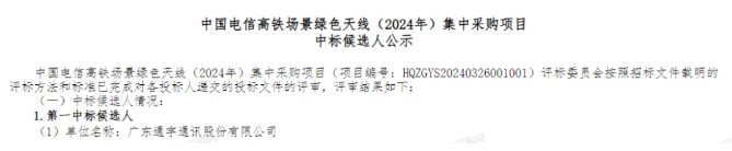 近日,通宇通讯在中国电信2024年高铁场景绿色天线集采项目中成功中标,成为第一候选人。这些绿色天线将用于2024年至2026年期间的高铁工程项目,共涉及四种规格型号,总采购规模为1.9万副。