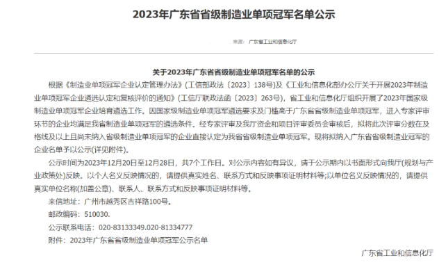 据悉,本次遴选工作由广东省工业和信息化厅组织开展,旨在评出制造业细分行业产品研发和生产,具备较好的创新基础条件和较强的技术创新能力,生产技术或工艺达到国际先进国内领先水平,单项产品市场占有率位居全球或国内行业前列的制造业企业或工业产品。