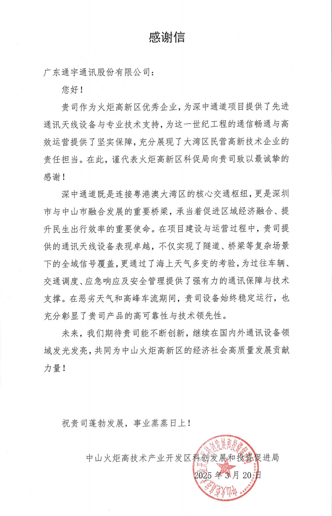 近日,广东通宇通讯股份有限公司收到中山火炬高技术产业开发区科创发展和投资促进局发来的感谢信。信中高度认可通宇通讯在深中通道项目中的突出贡献,同时肯定了其作为大湾区民营高新技术企业的责任担当。